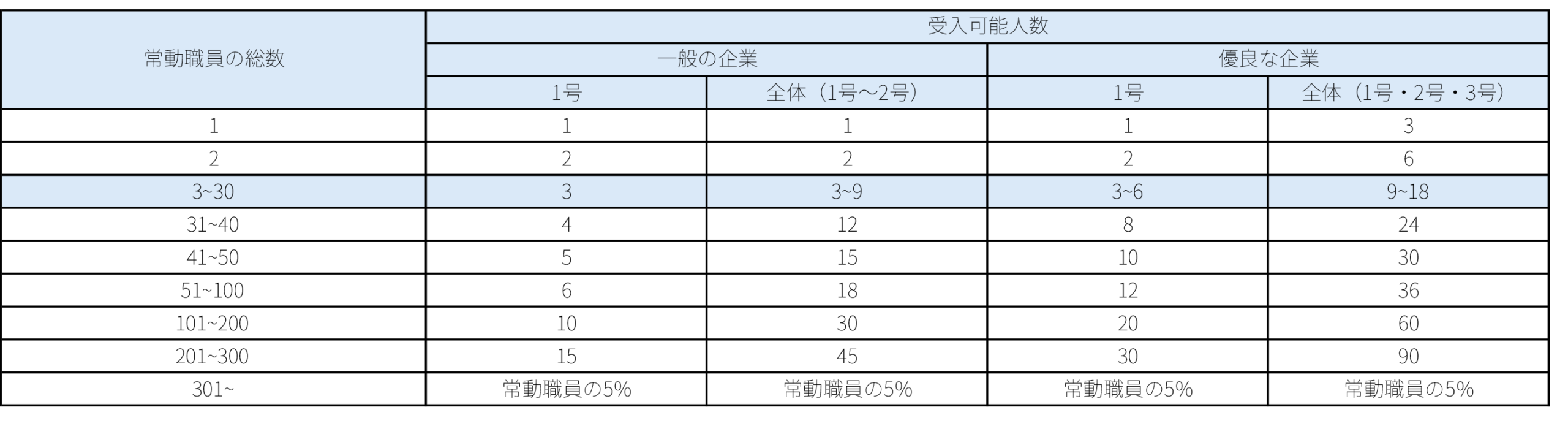 【受入人数】受入企業の常勤職員数により、受入可能な技能実習生の人数が決定します。職員数が多くなるにつれ、受け入れ可能人数が増加します。ただし、優良な企業であったとしても常勤職員を超える1号技能実習生の受入はできません。
